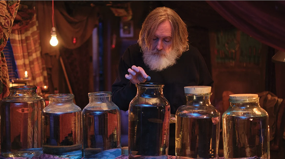 The story soon veers off on a tangent, and Michael’s main preoccupation becomes the cultivation of homunculi, small human-like beings, in large glass jars, following an ancient formula his father learnt in Egypt during his time in the army and has advised him to pursue. These bizarre creatures, the ‘Small Prophets’, briefly develop the power of divination and are incapable of not telling the truth if they are grown correctly, and Michael wants to discover what happened to his beloved partner. Meanwhile, he begins to develop an unlikely friendship with a young colleague, Kacey, played by Lauren Patel, whose curiosity, frankness, and good nature enable her to tolerate and even enjoy the older man’s waywardness and sharp tongue. Their connection is platonic, based on mutual support that has nothing to do with romance but is nonetheless intimate. Michael’s relationship with his father, played by Michael Palin, is similarly warm and benign; he is unendingly sensitive to Brian’s faltering memory and precarious balance between normality and off-beat eccentricity.